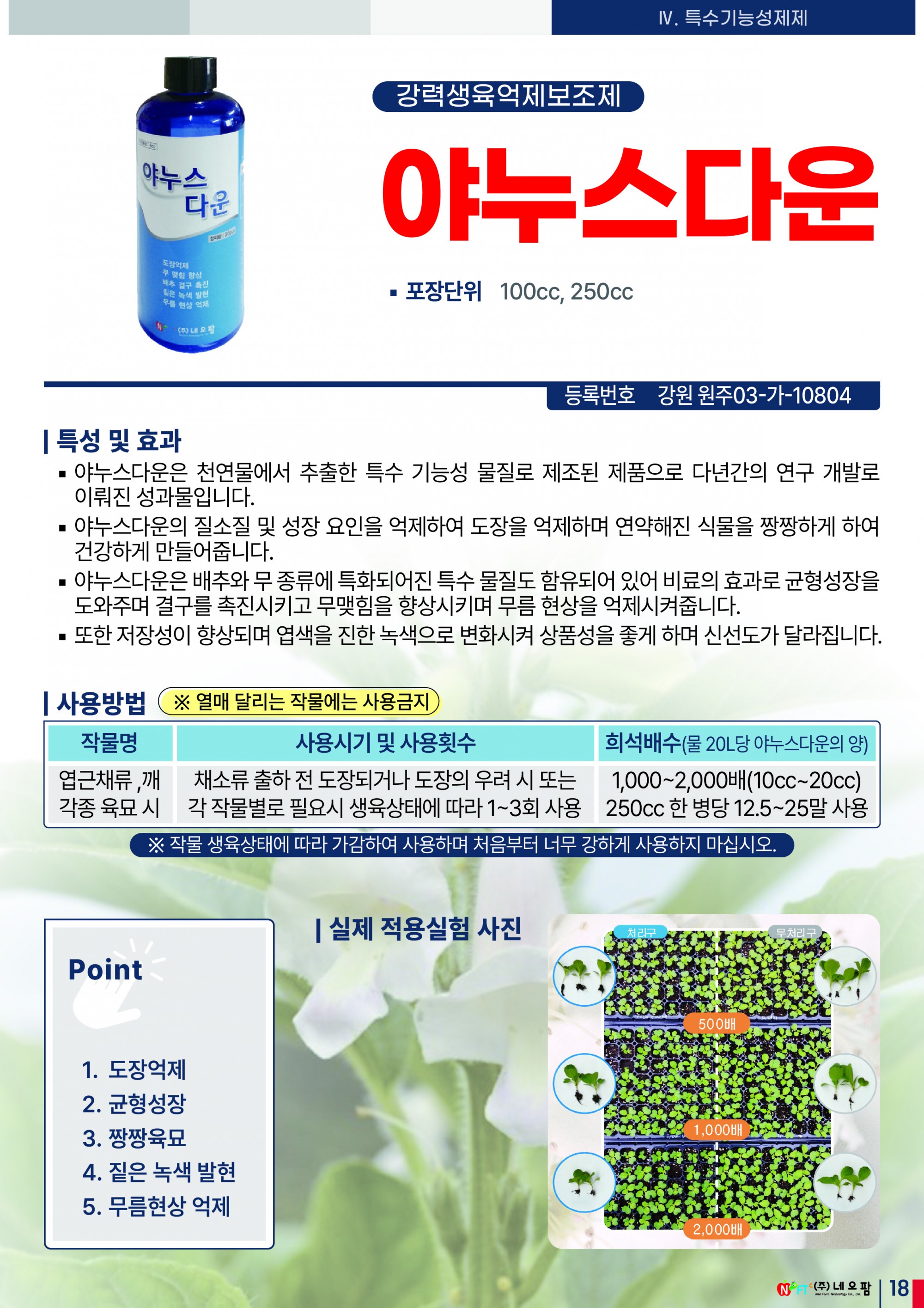1. 적정 사용량을 지켜 사용하며 수세가 약할 때나 어릴 때, 고온기 때 등 이상기후일 때는 소면적을 살포 시험한 후 사용하십시오.